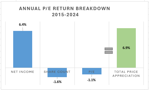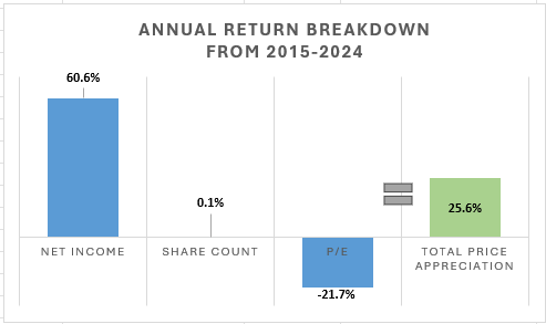 Analyzing this from a Prie-to-Earnings (P/E) ratio perspective, net income grew 60.6% per year - juiced by additional leverage in the business, from 2015-2024, with some minimal share dilution (0.1%), and a contraction in the P/E multiple (-21.7%), equating to a 25.6% return.