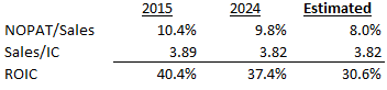 ROIIC: We do believe that the ROIIC will decline as most investments seem to be expenses, from the CEO & CFO’s comments. We can bifurcate ROIC into two components, the asset turnover & NOPAT margin. Historical ROIC has declined from 2015 to 2024, which is evidenced by the 33% ROIIC reported earlier.