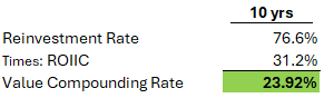 The result? A VCR of 24% annually — which aligns remarkably with the stock’s return of 25.6% per year over the same 10-year period.
