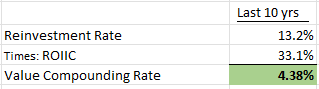 Multiplying these two gives you the VCR, an indication of growth based on past reinvestment rates & the returns earned on that reinvested capital. (Aswath Damodaran has many discussions on this topic as well.)