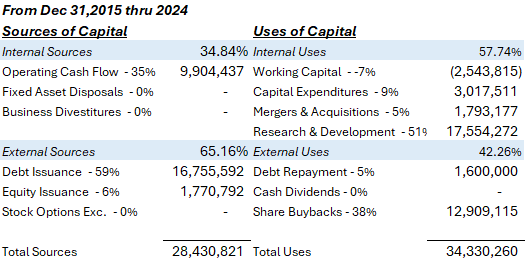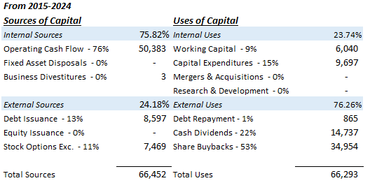 To further support the reinvestment rate (RR) analysis, it’s important to see how companies earn (Sources of Capital) and deploy (Uses of Capital) capital.
