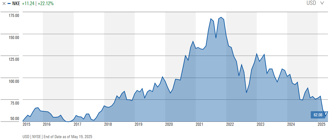 Nike is one of the most recognized brands on earth, earns higher ROIC and incremental ROIC, but over the past 10 years the stock has performed poorly, almost flat over that time period.